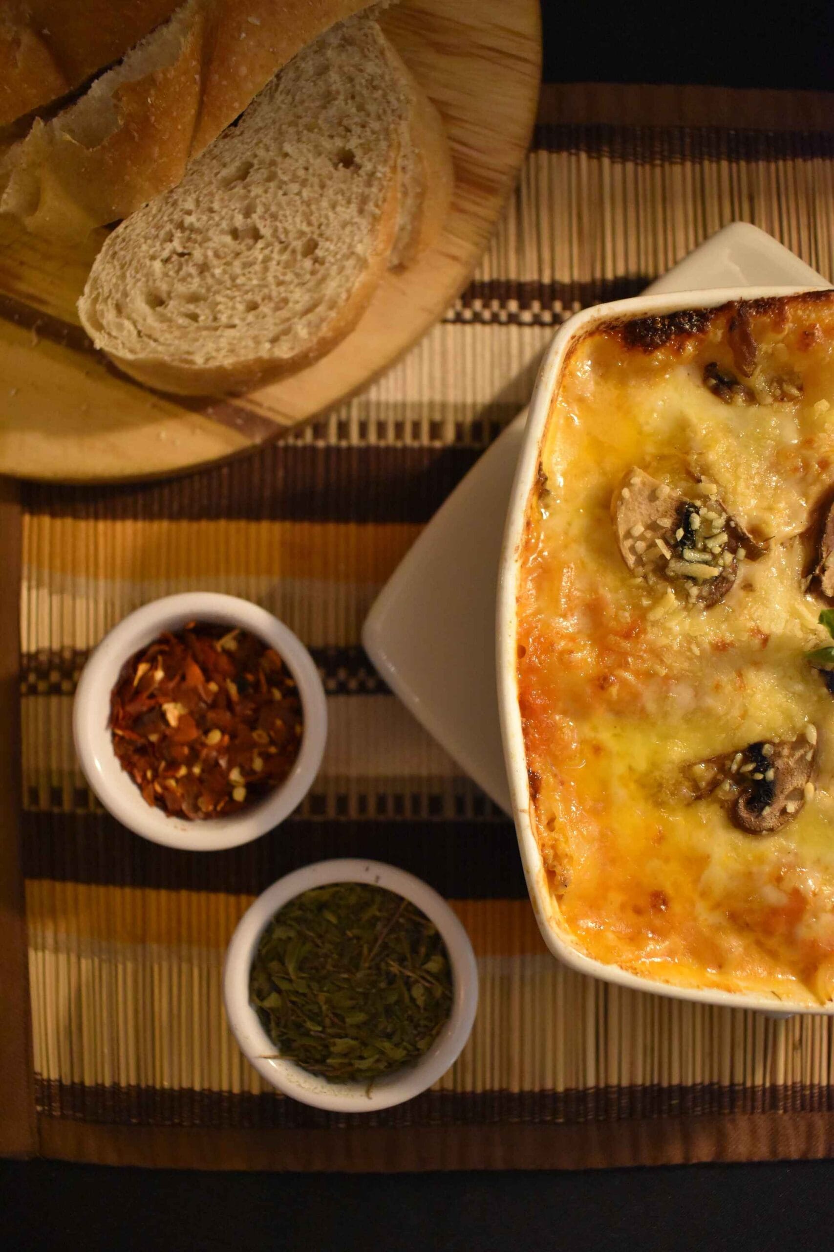 Salsa de la Casa, Bechamel, Ragú a la boloñesa, Pollo, Champiñones, Mozzarella, Parmesano