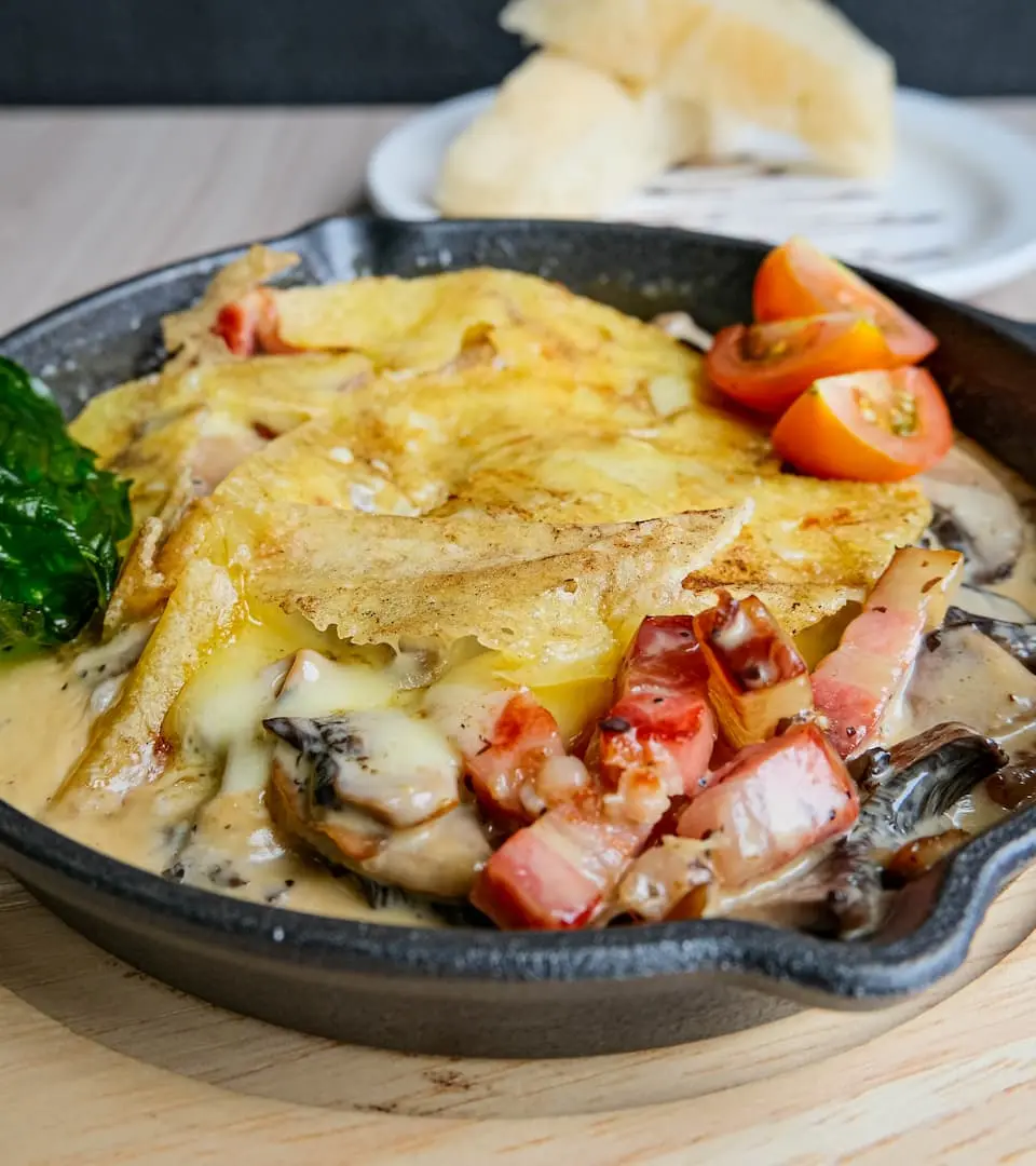 Puré de papa con sazon de la casa, chorizo italiano, carne mechada, champiñones, queso paipa, romero.